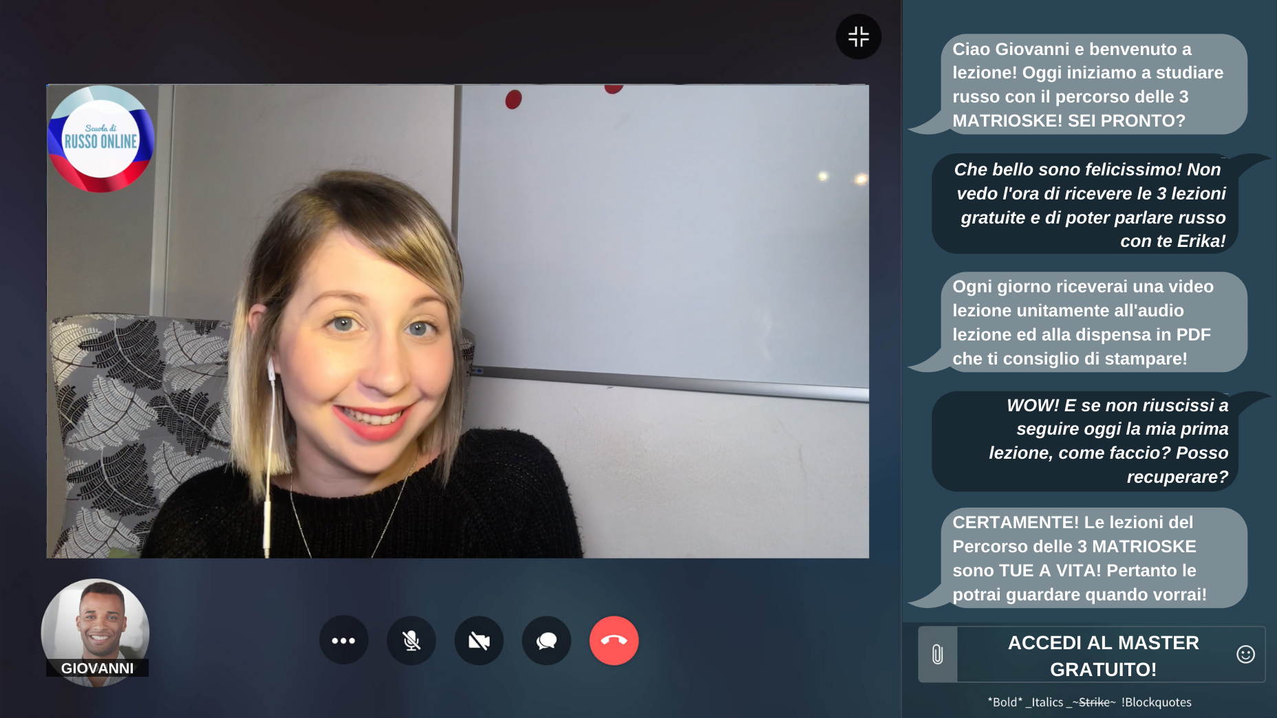 "Studiavo russo all'università di Bari, le aule di grammatica erano ampie e si lavorava bene, ma quando dovevamo assistere alle lezioni di conversazione, eravamo tutti ammassati e avevamo 30 posti liberi per 300 studenti. Ho iniziato a studiare russo con Erika perché mi serviva saper conversare e ora, parlarlo non è più un problema!"