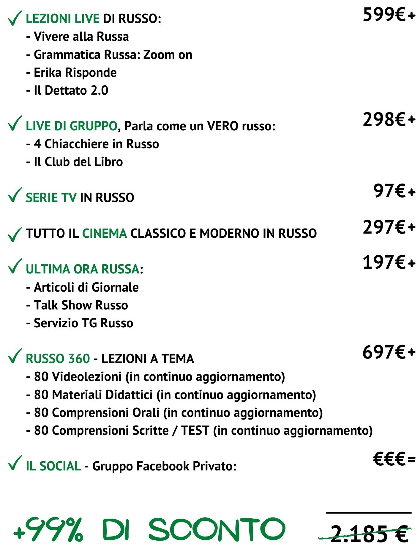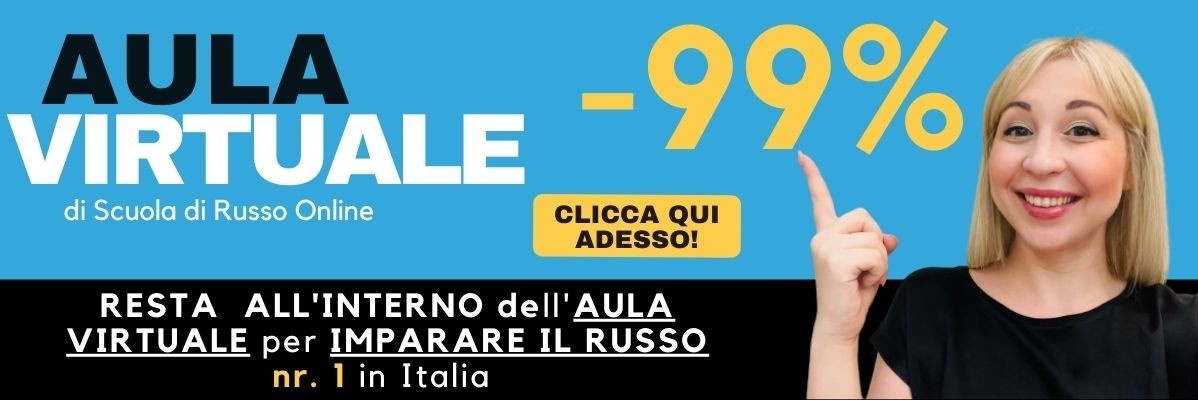 Mantenendo caldo il tuo posto all'interno della nostra Nuova Aula Virtuale, definita nel 2020 l'Accademia numero 1 in Italia per imparare il russo, avrai accesso ogni singolo mese a 7 iniziative didattiche spalmate in numerosissimi incontri mensili per un valore totale di 2.185€. No, non si tratta di numeri del Lotto, ma del valore reale ed effettivo di ciò che contiene la nostra aula virtuale, non a caso definita la nr.1 in Italia!